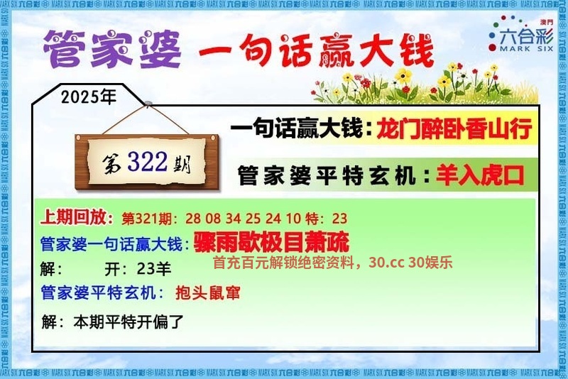 323期一句话赢大钱╠春风谁许暂鸣珂╣ 解料:春风谁许暂鸣珂解春肖的生肖兔、虎、龙。 综合:兔虎猴狗鸡猪 精选特码:03.15.16.28.10.22.20.32.21.33.19.31 |